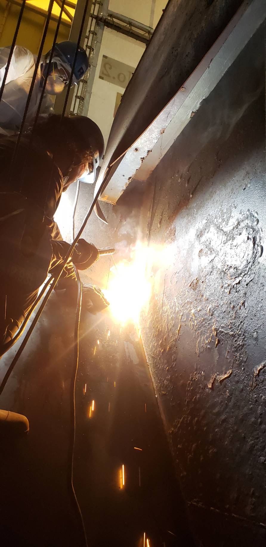 ゴミ処理施設の ポッパー内壁面の腐食が激しいので新しい鉄板を貼り付ける工事です。