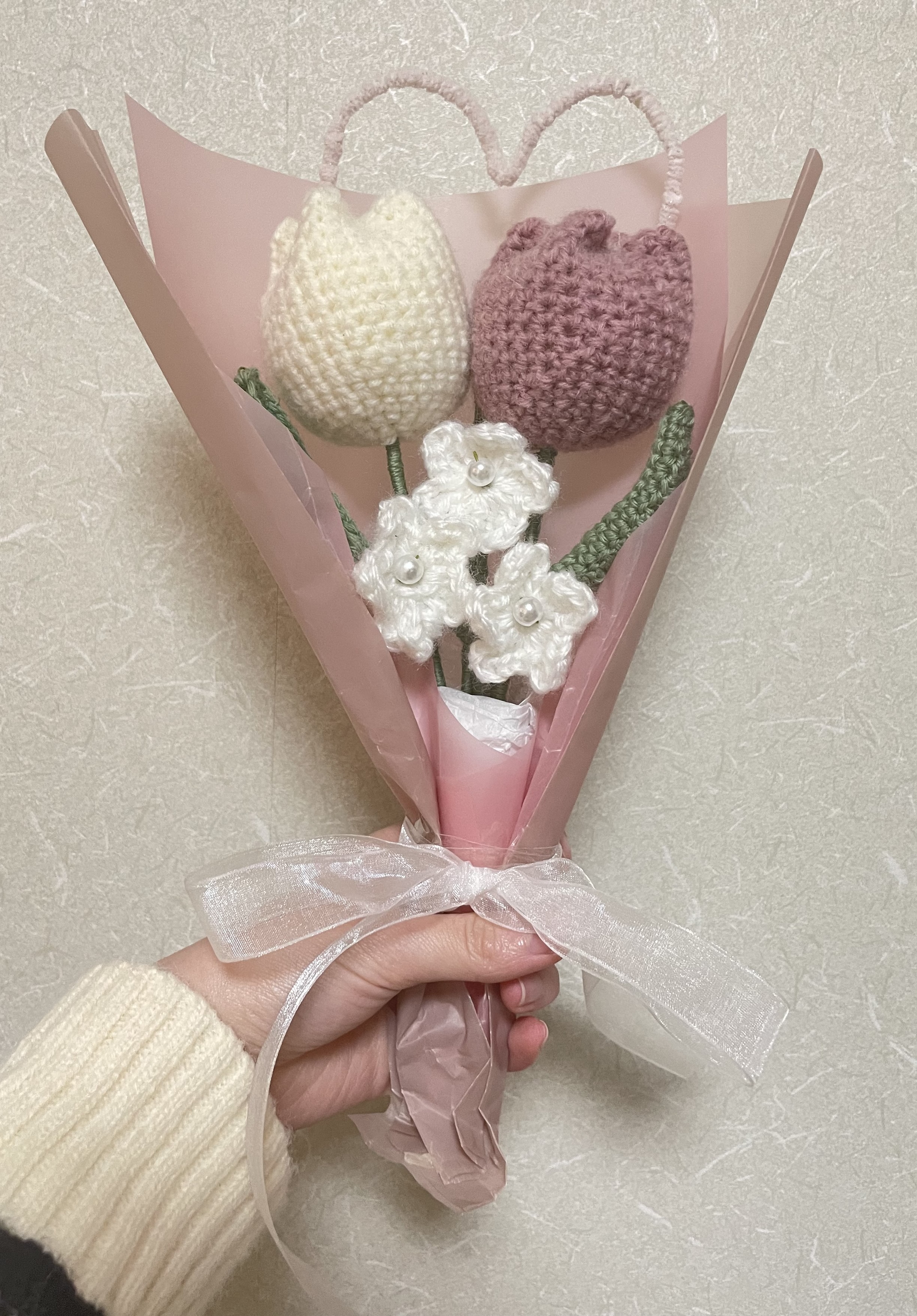普通の花束とは違って、編み物なので枯れる心配がなくずっと形として残るのがいいところです!