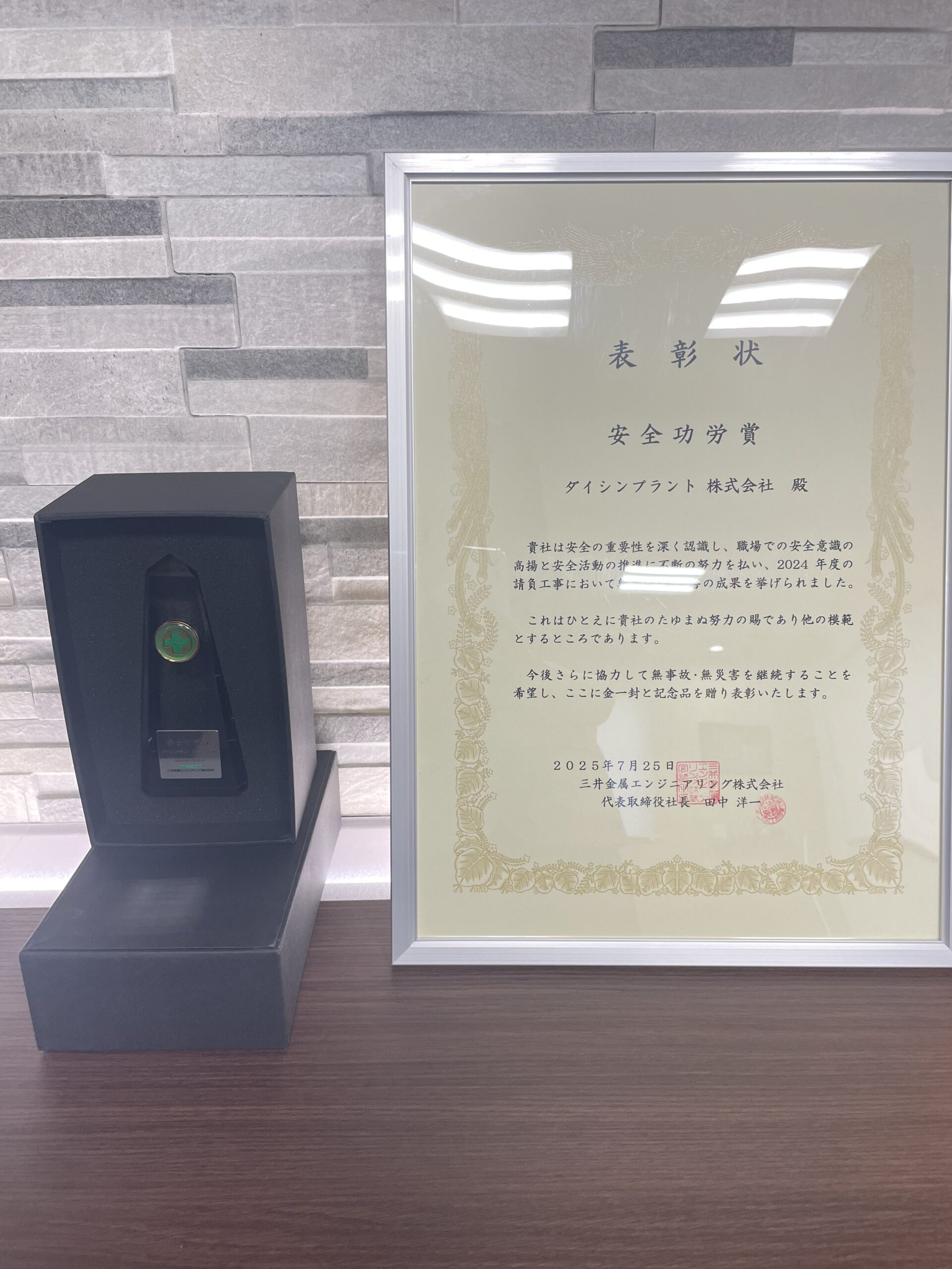 無事故・無災害の成果が評価され、「安全功労賞」をいただきました(*´꒳`*ノノ゙パチパチ