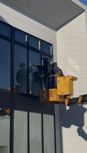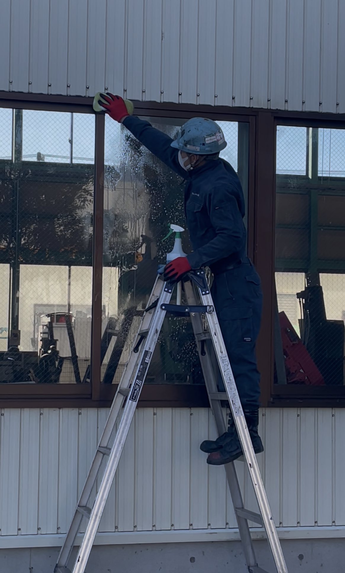 最後に、工事部の方々が本社と工場の窓拭きを行っていましたので紹介します。