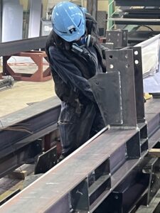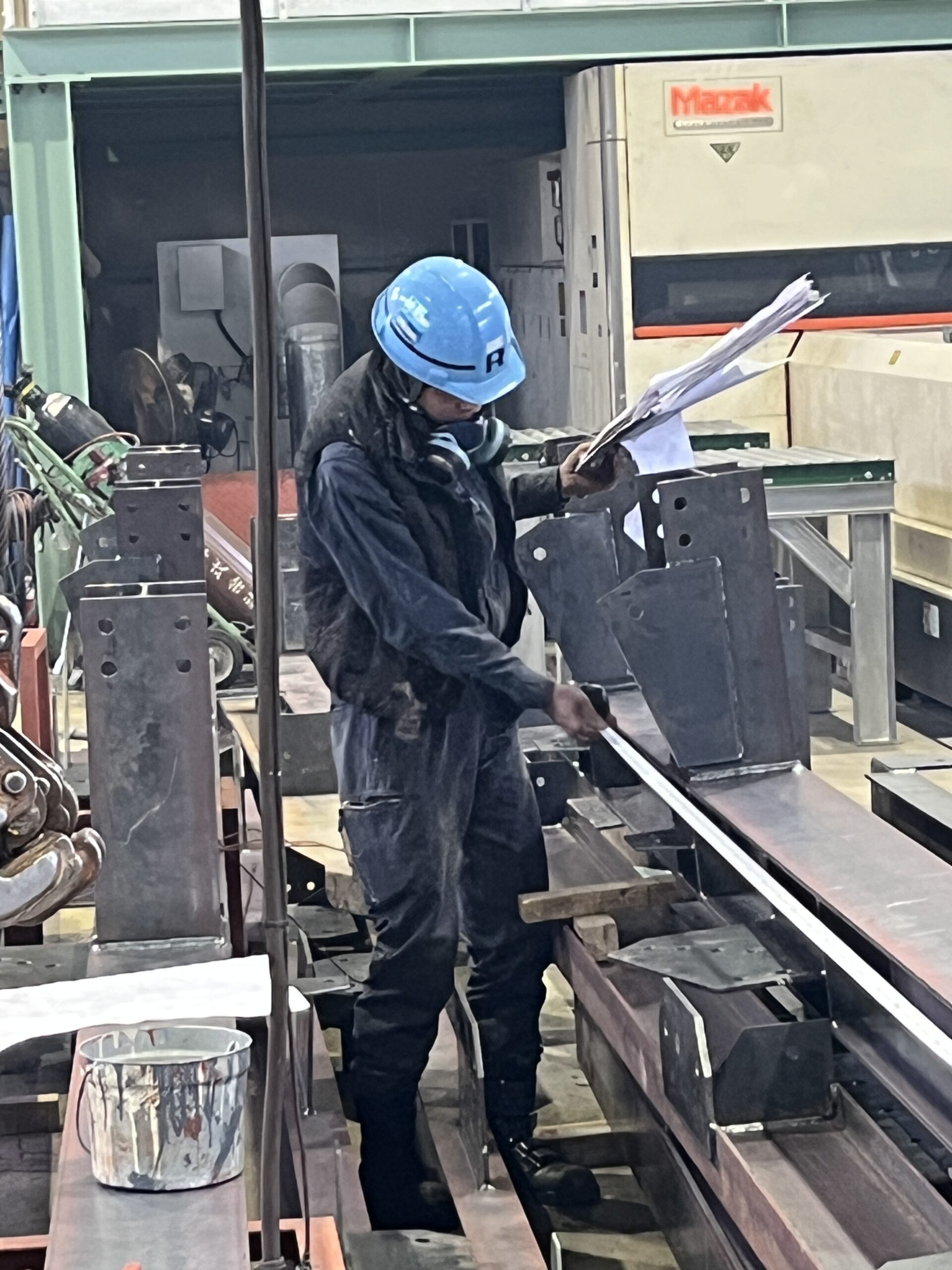 製作中の製品が図面通りになっているか、図面を見ながらの確認中です。現場に納入後に誤りがあった場合、現地での手直し、もしくは再度工場に戻しての手直しとなってしまいます。そのため、この確認作業は欠かすことができません。