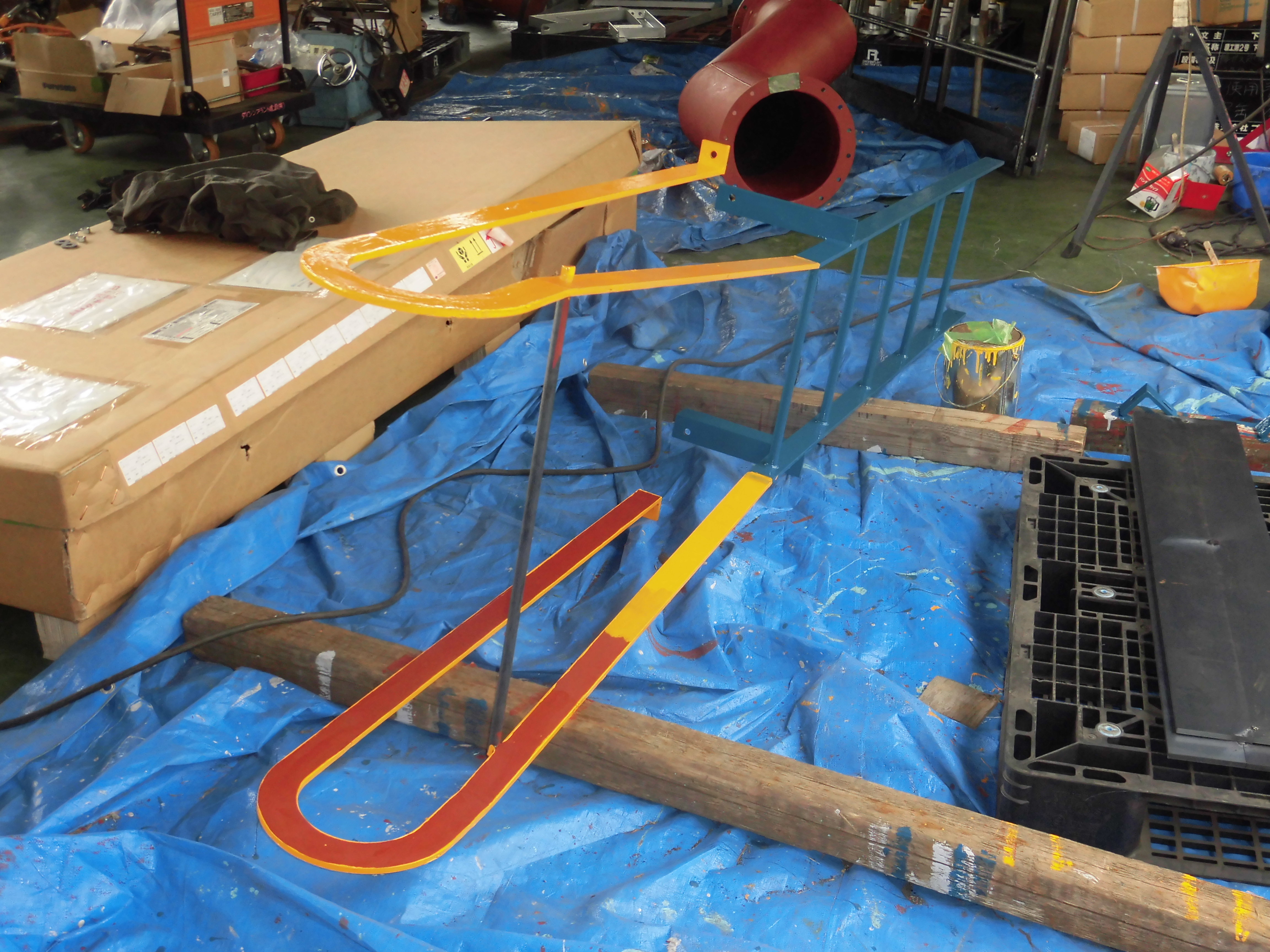 下地となるのが、錆止めの赤色で、完成状態は、黄色と青の2色になるそうです。