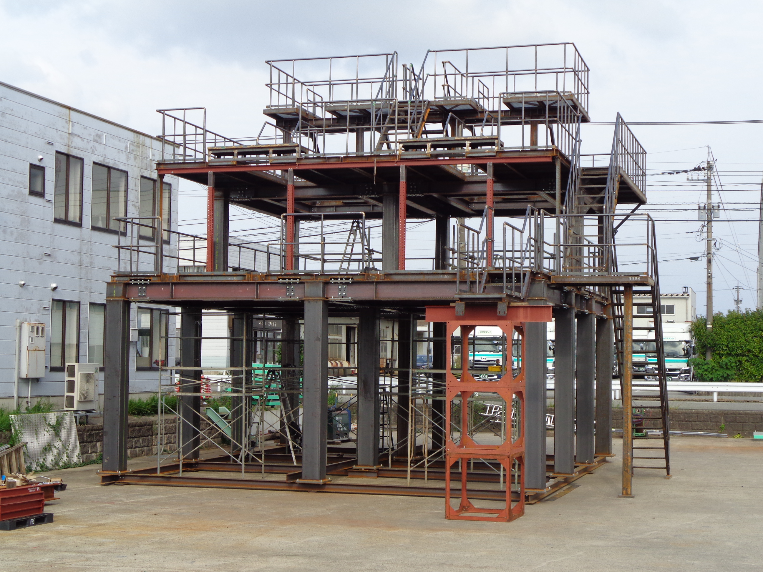手摺、歩廊、階段等多くの部品が組み立てられ、写真のような架台が完成致しました!!